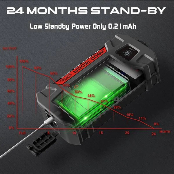 - 60W two-way fast charging: a full charge takes just 45 minutes, and a 3-minute charge can provide a jump-start. J1500 LiFePO4 12v auto battery booster can last up to 24 months on a full charge. Built-in power bank provides USB-A (18W)/Type-C (PD60W) output, readily charging smartphones, tablets, laptops, wearables, and more.