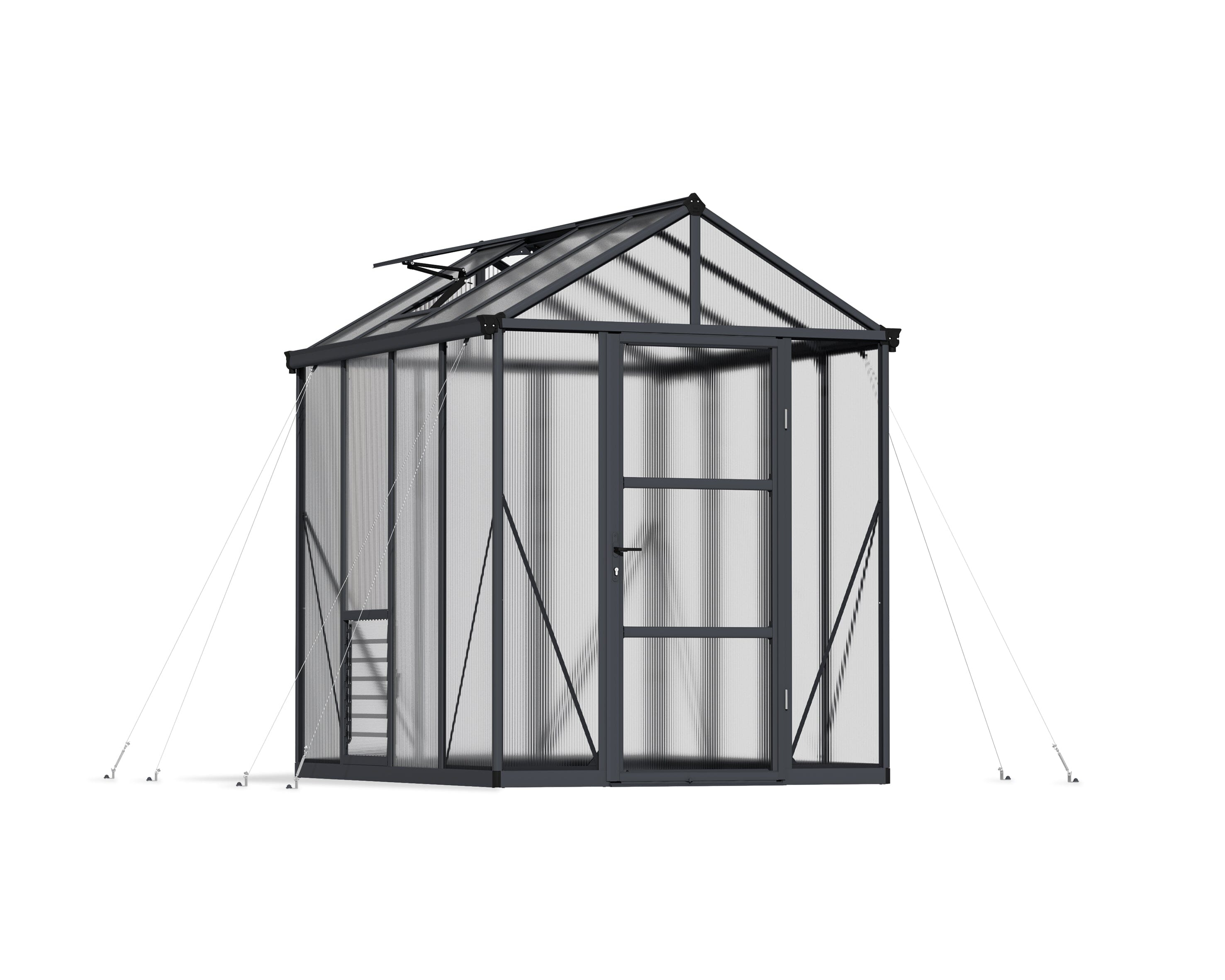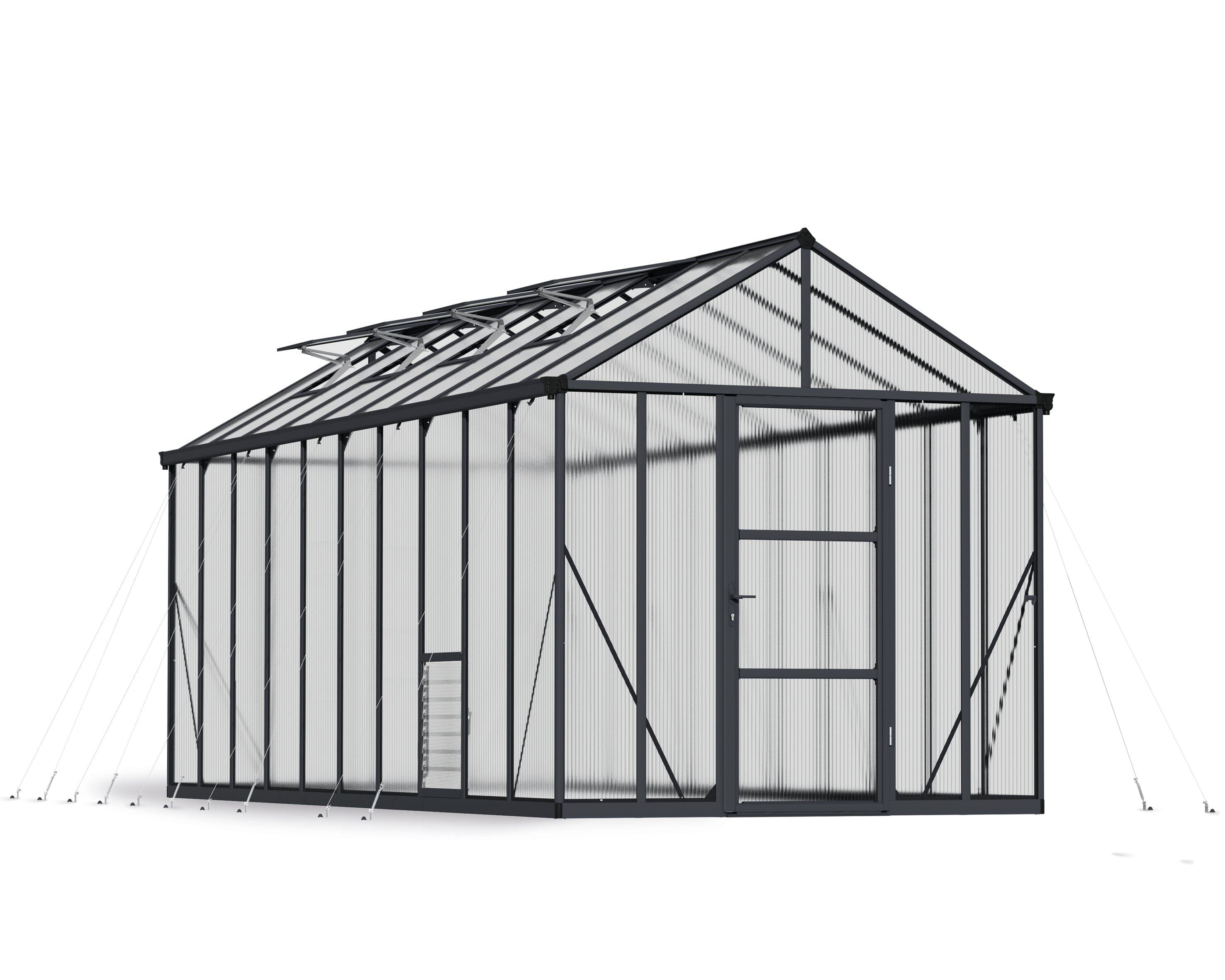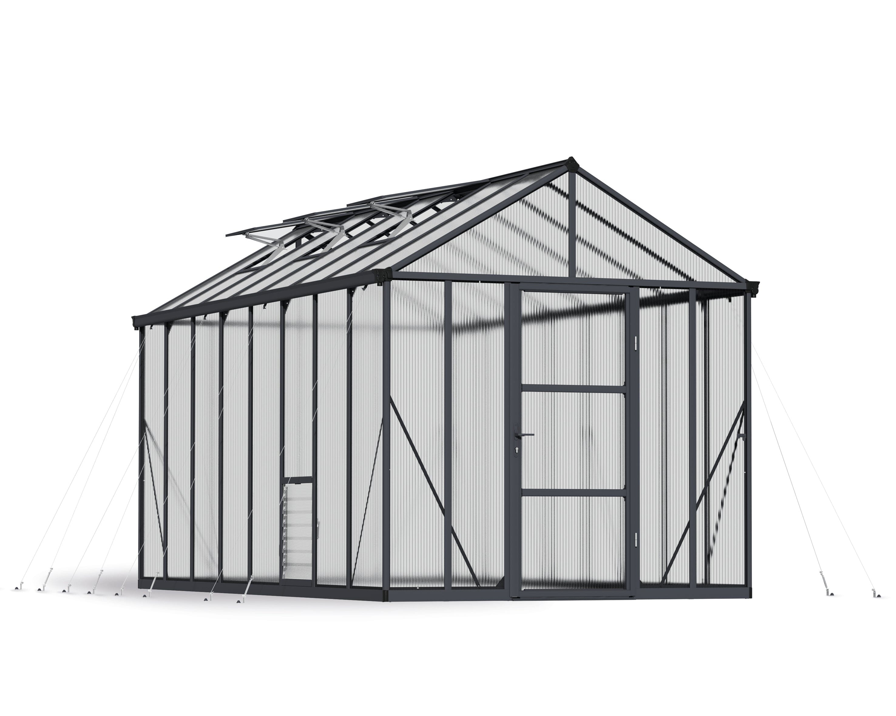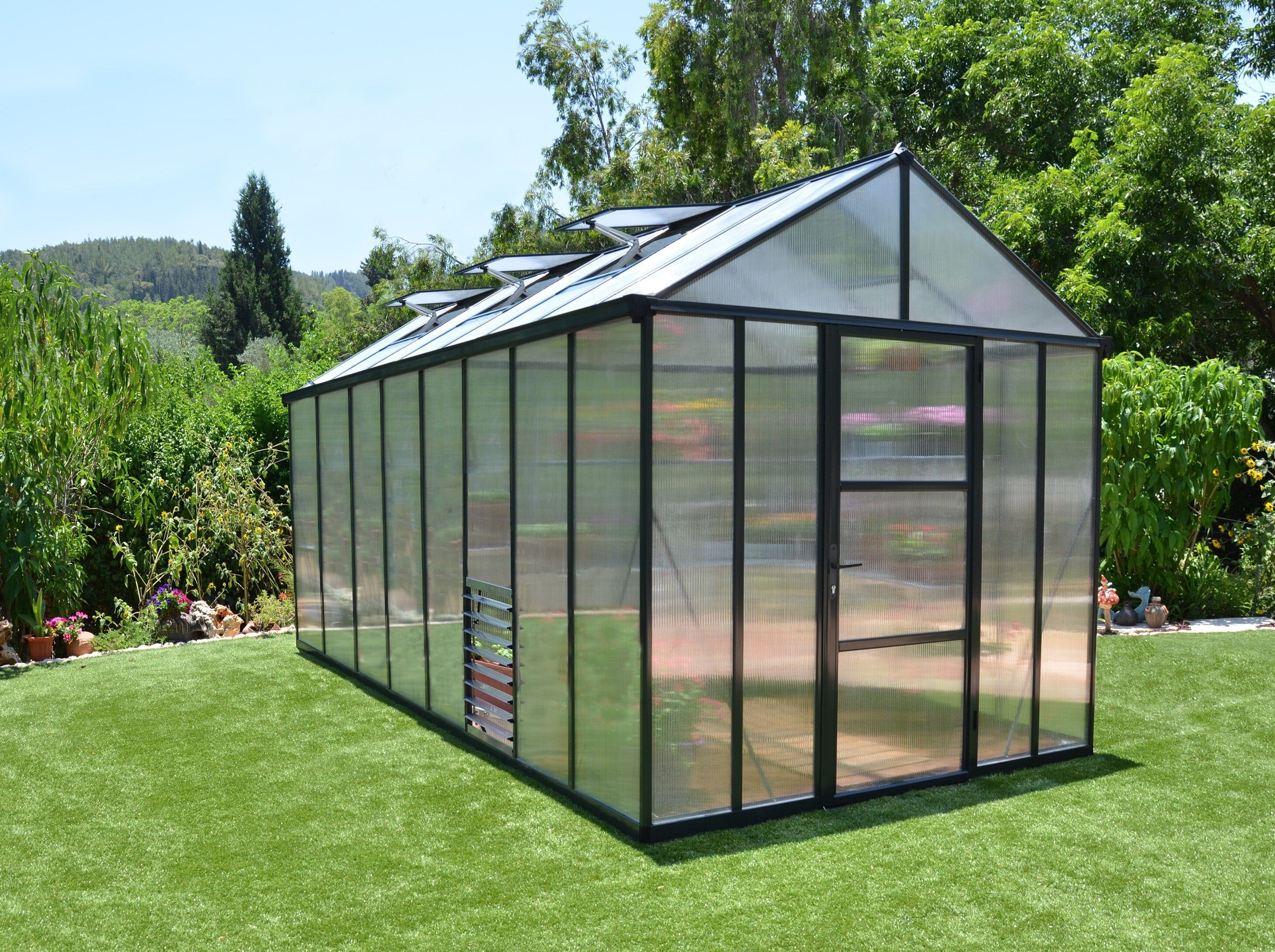 Palram – Canopia’s Glory Greenhouse Series is designed for professional gardening enthusiasts. The strong and robust gray powder-coated aluminum frame and 10mm twin-wall polycarbonate panels make this a professional grade greenhouse that can be heated and/or cooled for year-round usage. The side louver window and roof vent allow proper air flow for the ideal temperature to keep plants healthy. The heavy-duty door is over 31 inches wide and can be locked. The door threshold allows easy access for wheelchairs or wheelbarrows and the gutter system will allow you to collect fresh rainwater for your plants. With sidewalls over 6′ tall and a peak of almost 9′, you can trellis your tall and leafy plants or over-winter your small trees. If you are serious about growing, this is your greenhouse.