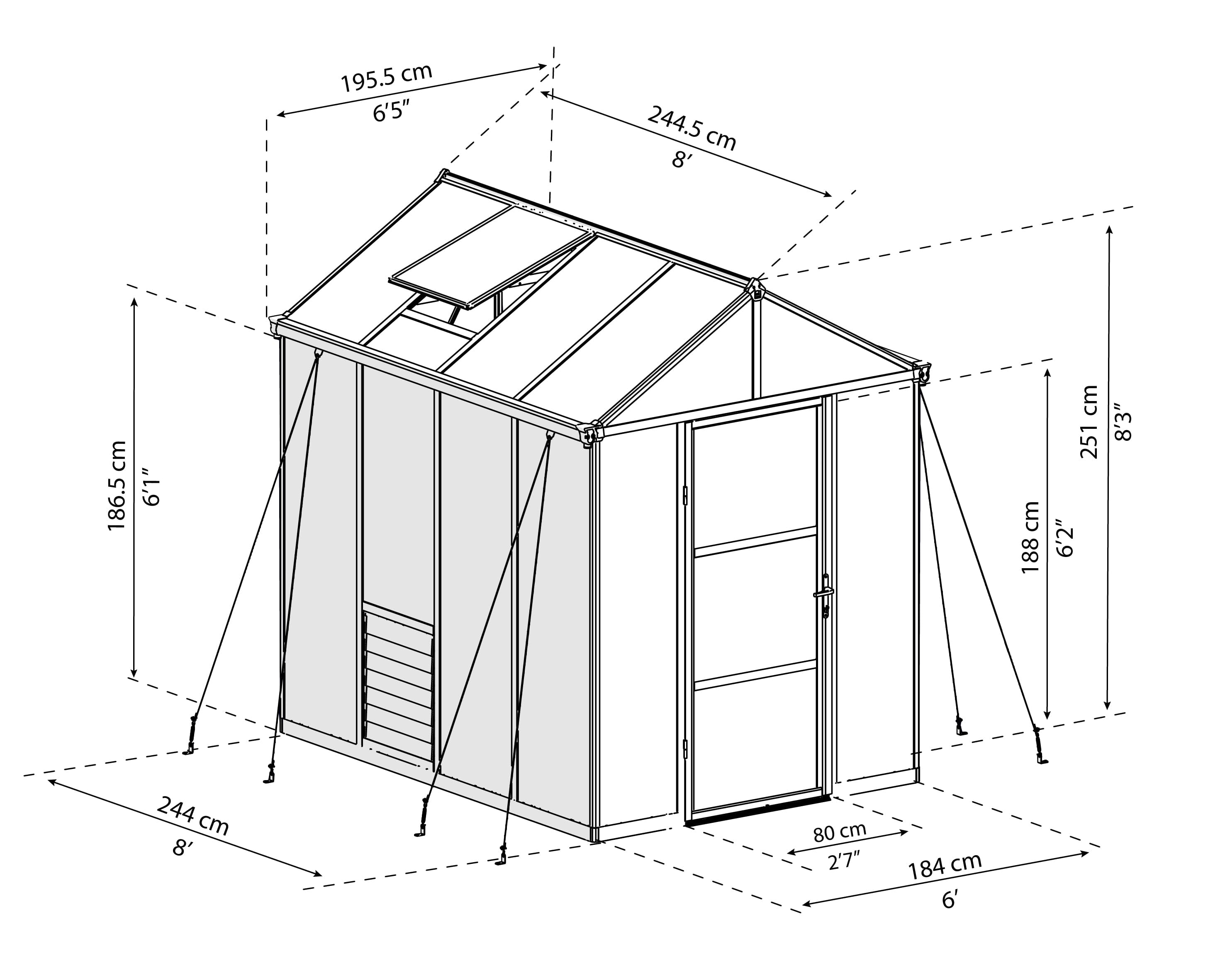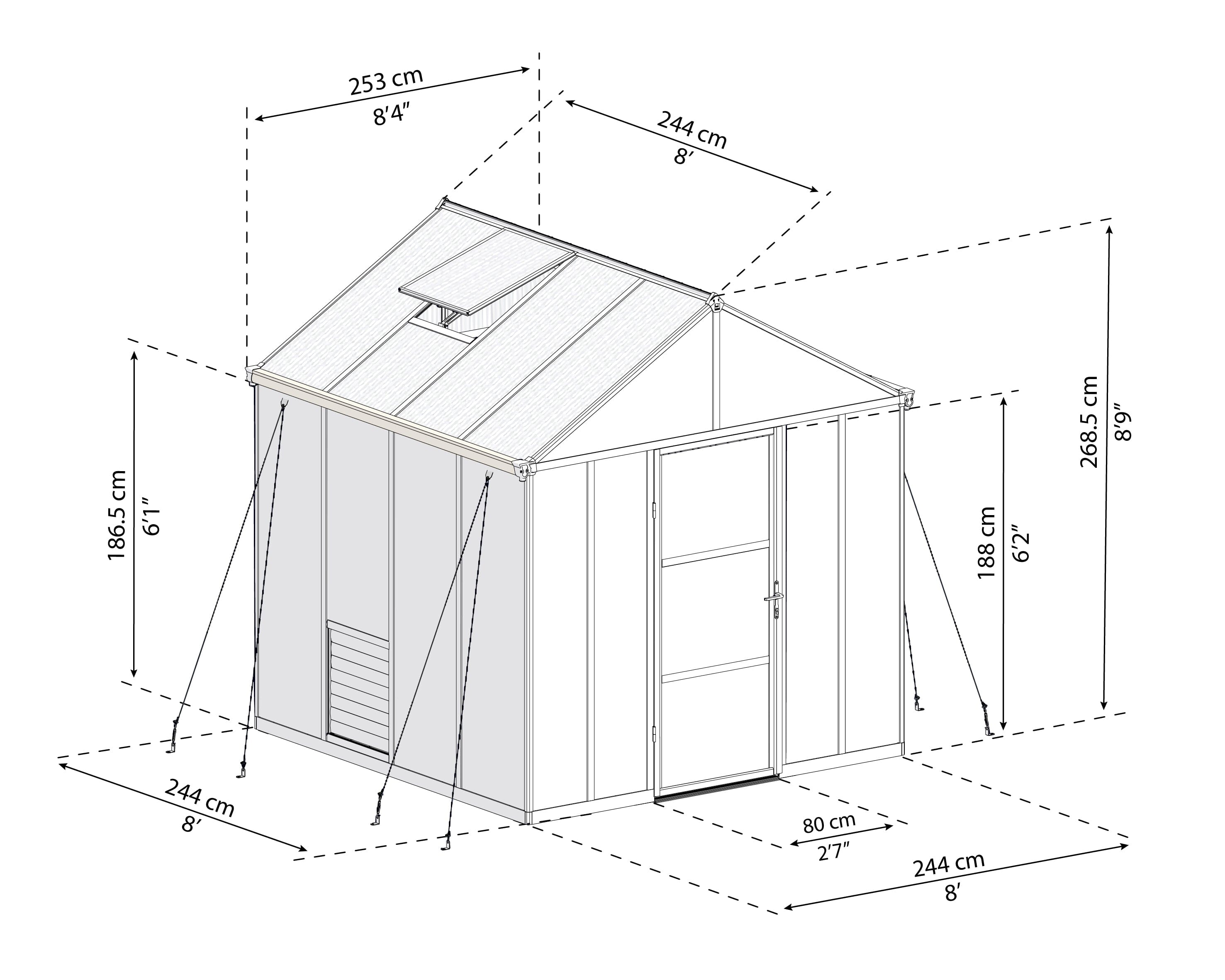 - High headroom (103″), and tall eaves (73.4″) provide large interior space and ample room for trellising tall and leafy plants