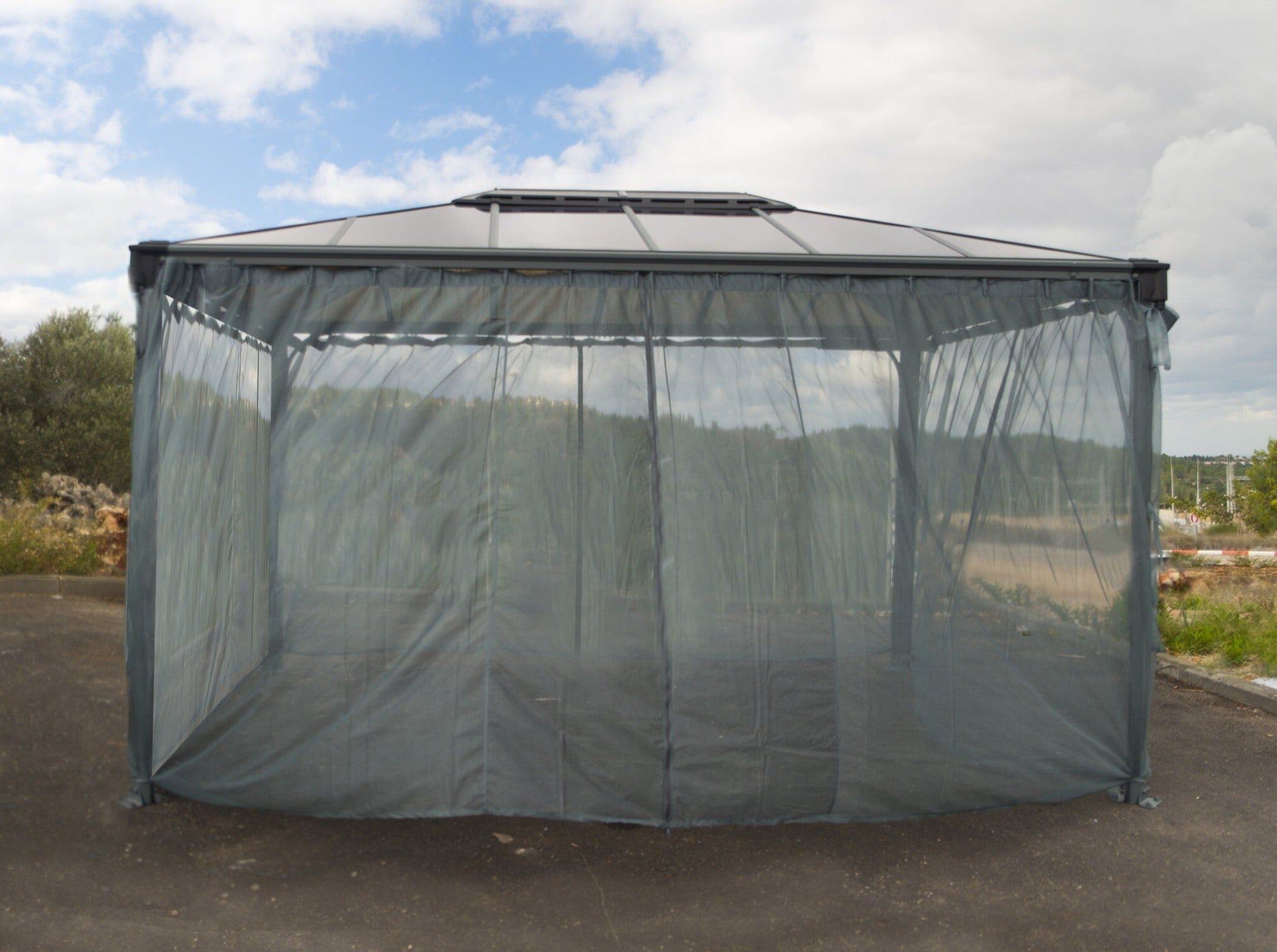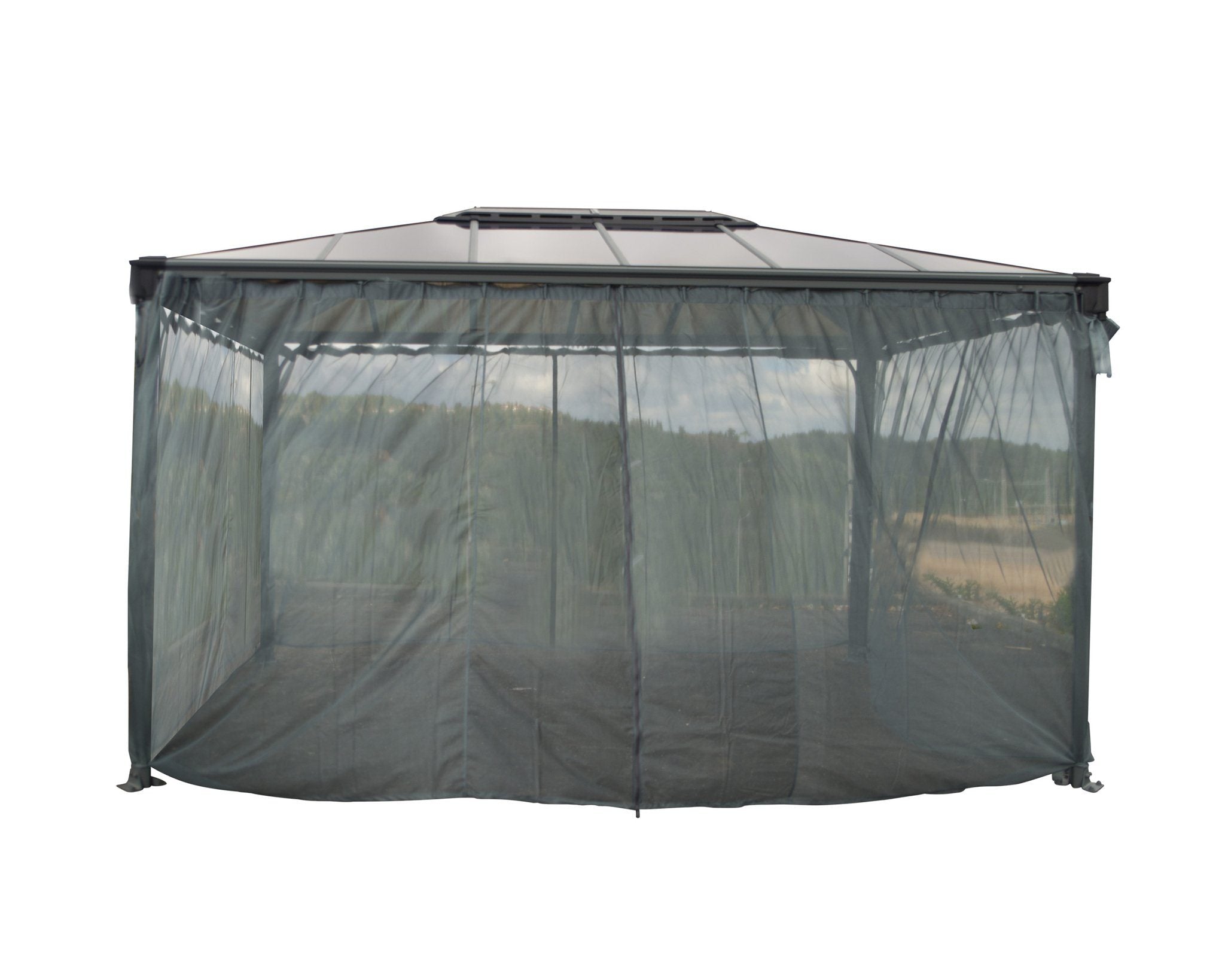 The Martinique 4300 Gazebo Netting Set will add to your comfort by keeping out unwanted bugs. The lightweight polyester screen comes with hangers that slide into the track line of your Gazebo. Fits the Palram Martinique 10′ x 14′ Gazebo. One package has four screens to cover your entire Gazebo. Easy to install and easy to use. Includes zipper to connect the screens together and ties to pull the screens to the corner posts.