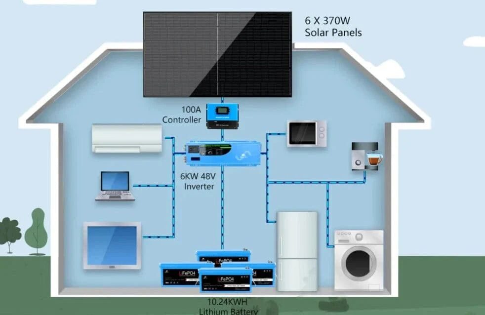 SunGoldPower Off Grid Solar Kit 6000W 48VDC 120V/240V LifePO4 10.24KWH Lithium Battery 6 X 370 Watt Solar Panels SGK-PRO64