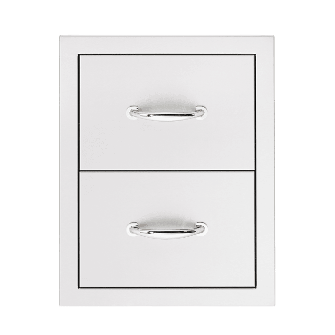 The 17-Inch Double Drawer w/ Masonry Frame Return has the durability of complete #304 stainless steel construction, smooth gliding and soft closing on heavy-duty tracks, and an industry-best Gold Standard Lifetime Warranty.